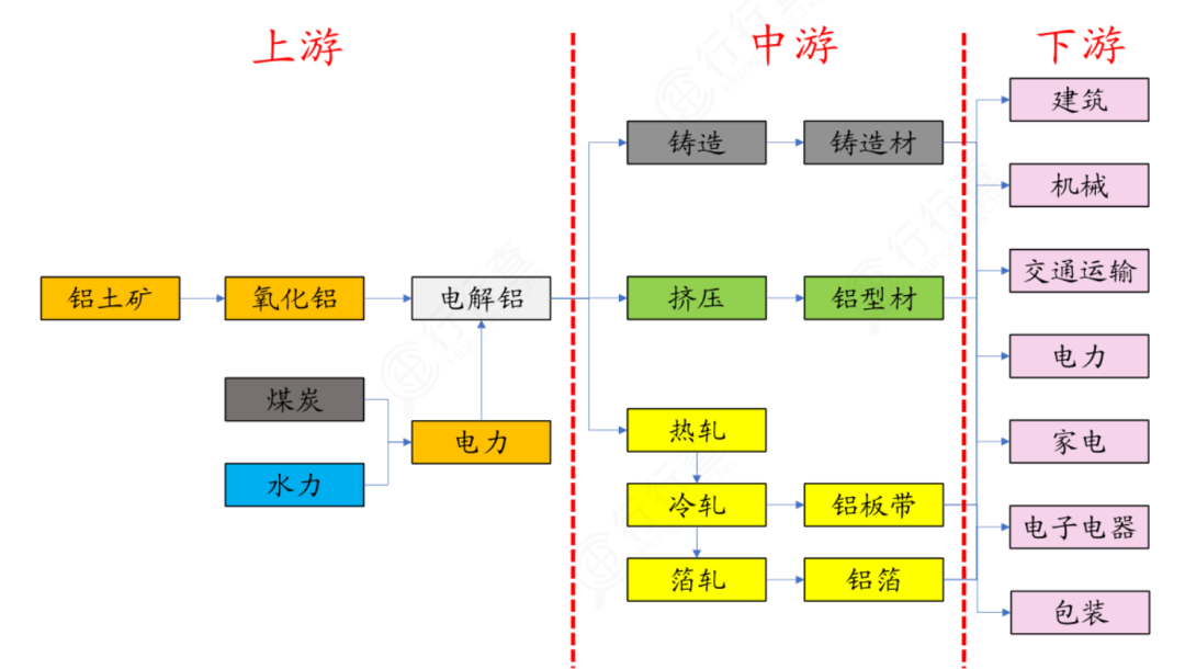 铝产业链上游为“铝土矿-氧化铝-电解铝”,生产铝加工的原材料。