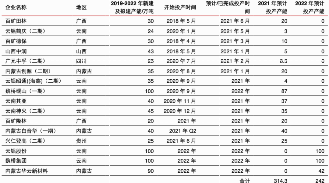 根据上海有色网的数据和各公司公告,2021年/2022年中国规划的电解铝供应产能高达314.3万吨/290万吨,其中置换产能为107万吨/263万吨,2021/2022年实际的规划净增量为207.3万吨/17万吨。