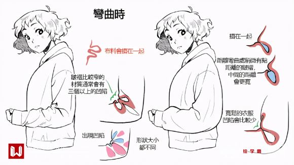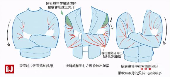 皱褶的形状会随著手臂的动作发生大幅度的变化。