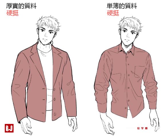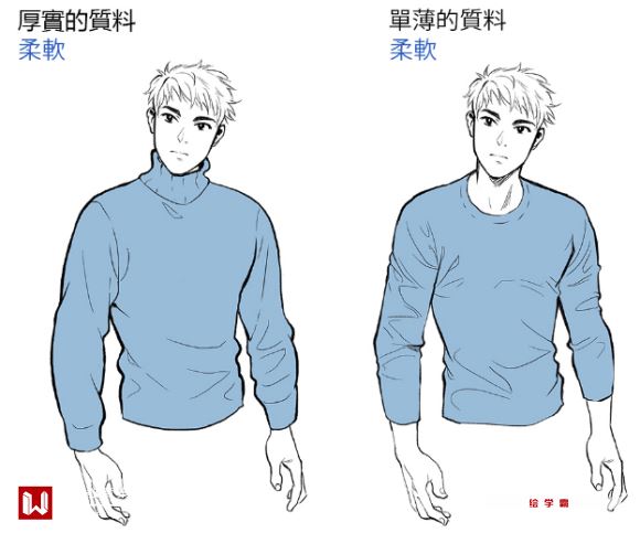 皱褶的多寡取决于布料重量和素材种类,在绘製布料时,建议首先考虑质料的「厚/薄」、「硬/软」、「重/轻」、「平滑/粗糙」。