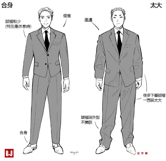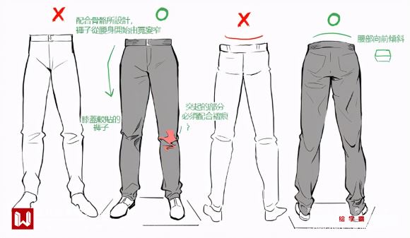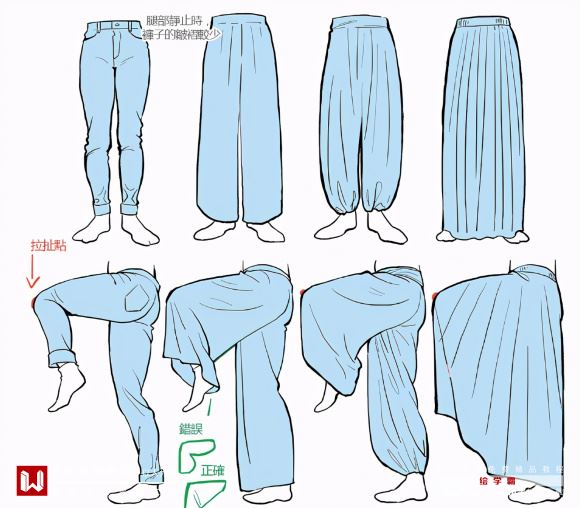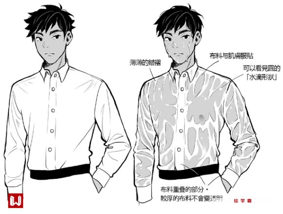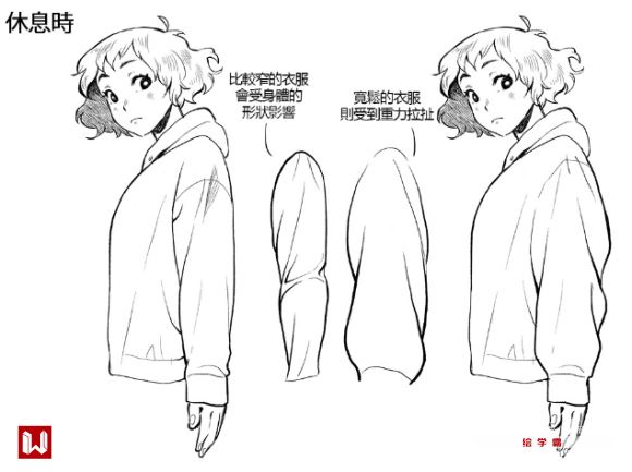 宽松衣服和贴身衣服产生的皱褶也不一样。贴身衣服的皱褶会沿著身体曲线发生变化,而宽松的衣服上较常出现从拉扯点朝地面下垂的皱褶。