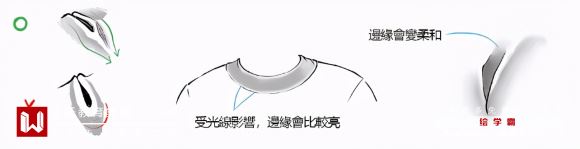 绘制皱褶的阴影时,要区分使用柔和的阴影边缘和尖锐的阴影边缘。