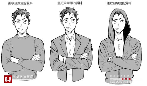 在绘制皱褶的时候,考虑布料的材质是一件非常重要的事情。每种质料都有它的特性,认识布料的材质有助于我们绘製出适当的摺痕位置,并想像皱褶产生的阴影会像什麽样子。