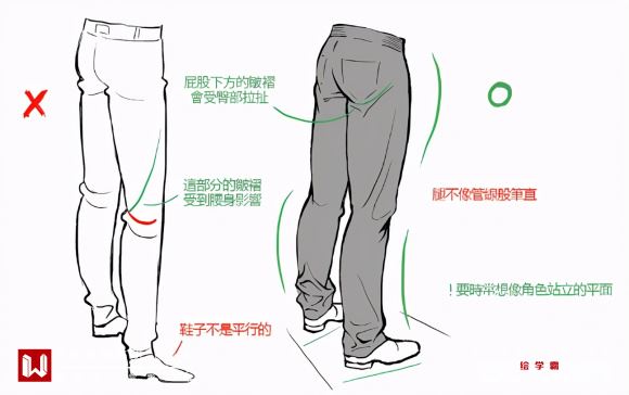 从背面来看,臀部下方形成的皱褶摺痕会向腰部延伸,膝盖部分形成的皱褶也会明显地拉向腰身。通常在人站著休息时,比较不会形成动态的皱褶。
