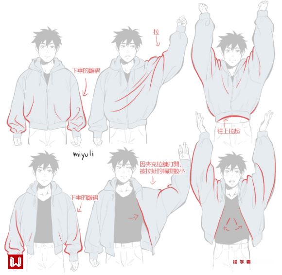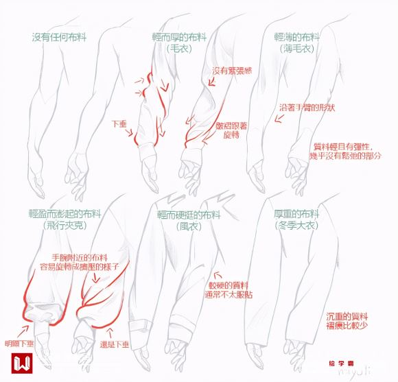 依质料不同,阴影(例如摺痕之间的宽度)在柔软阴影和亮部之间会发生变化,如果想追求更高的作品完成度,建议多多接触各种材质并加以研究,丰富自己的知识。