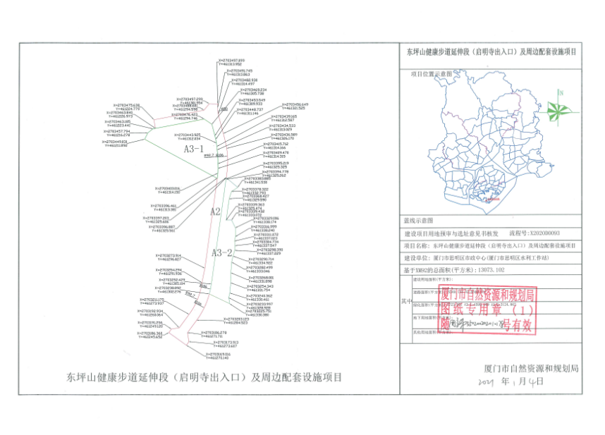 启动东坪山健康步道延伸段(启明寺出入口)及周边配套设施项目土地征收工作。该项目用地位于厦门市思明区滨海街道曾厝垵社区,土地征收面积约13073.102平方米,具体范围及坐标详见附图。