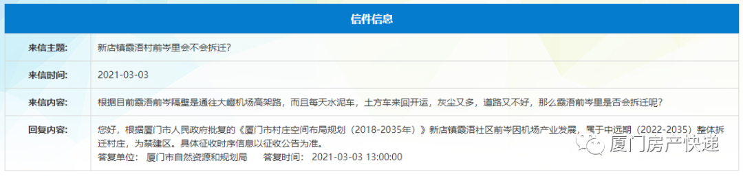 根据厦门市人民政府批复的《厦门市村庄空间布局规划(2018-2035年)》新店镇霞浯社区前岑因机场产业发展,属于中远期(2022-2035)整体拆迁村庄,为禁建区。
