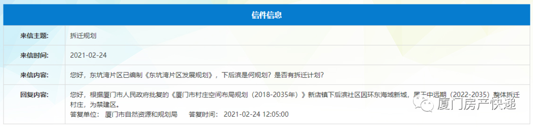 根据厦门市人民政府批复的《厦门市村庄空间布局规划(2018-2035年)》新店镇下后滨社区因环东海域新城,属于中远期(2022-2035)整体拆迁村庄,为禁建区。