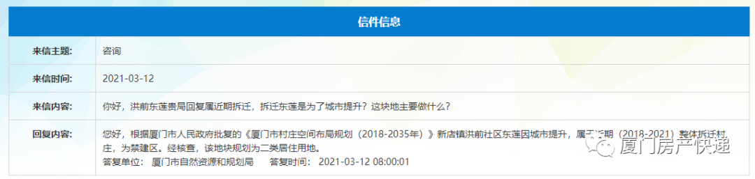 根据厦门市人民政府批复的《厦门市村庄空间布局规划(2018-2035年)》新店镇洪前社区东莲因城市提升,属于近期(2018-2021)整体拆迁村庄,为禁建区。经核查,该地块规划为二类居住用地。
