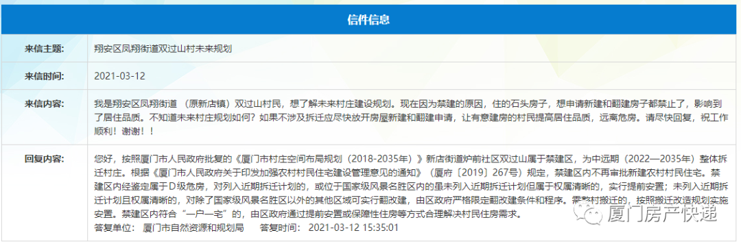 按照厦门市人民政府批复的《厦门市村庄空间布局规划(2018-2035年)》新店街道炉前社区双过山属于禁建区,为中远期(2022—2035年)整体拆迁村庄。