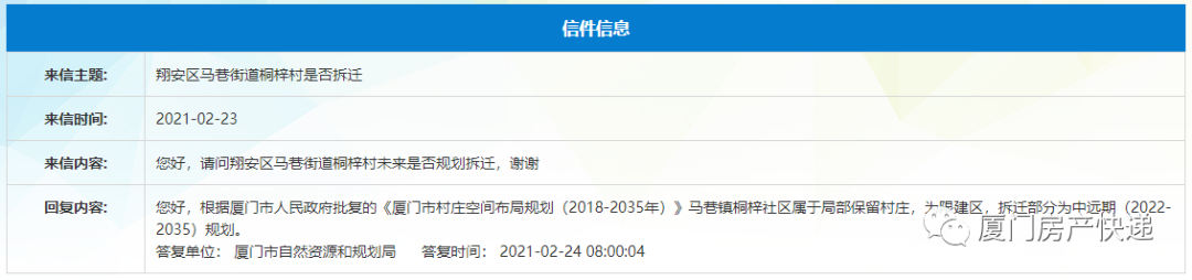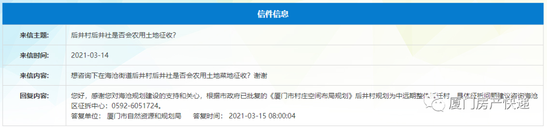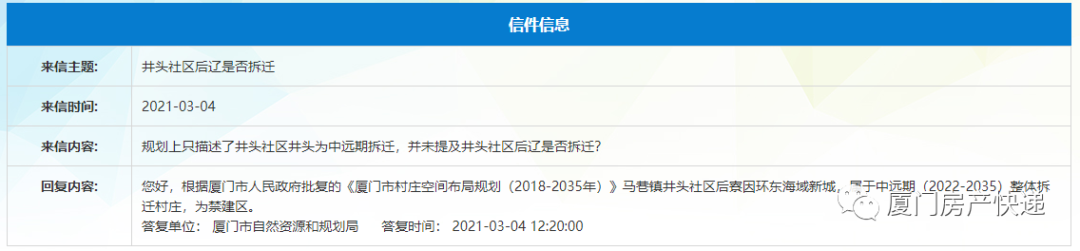 根据市政府已批复的《厦门市村庄空间布局规划》后井村规划为中远期整体拆迁村。
