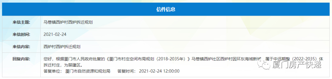 根据厦门市人民政府批复的《厦门市村庄空间布局规划(2018-2035年)》马巷镇西炉社区西炉村因环东海域新城,属于中远期整(2022-2035)体拆迁村庄,为禁建区。