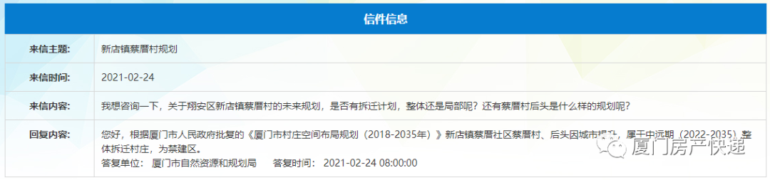 根据厦门市人民政府批复的《厦门市村庄空间布局规划(2018-2035年)》新店镇蔡厝社区蔡厝村、后头因城市提升,属于中远期(2022-2035)整体拆迁村庄,为禁建区。