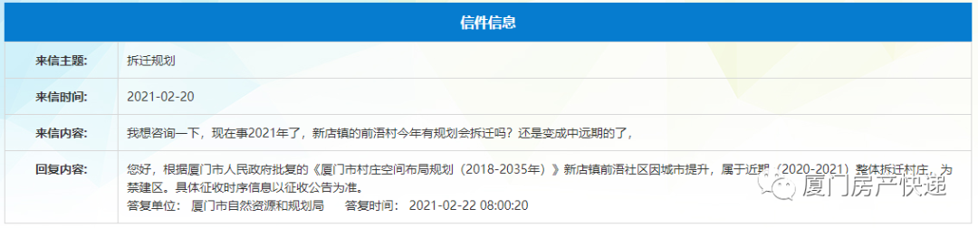 根据厦门市人民政府批复的《厦门市村庄空间布局规划(2018-2035年)》新店镇前浯社区因城市提升,属于近期(2020-2021)整体拆迁村庄,为禁建区。
