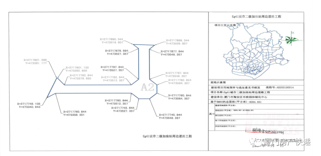 Eg41城市二级加油站周边道路工程项目用地位于厦门市翔安区新店街道彭厝村,用地面积8265平方米(具体范围及坐标详见附图),最终征收范围以土地现状调查和正式批复为准。