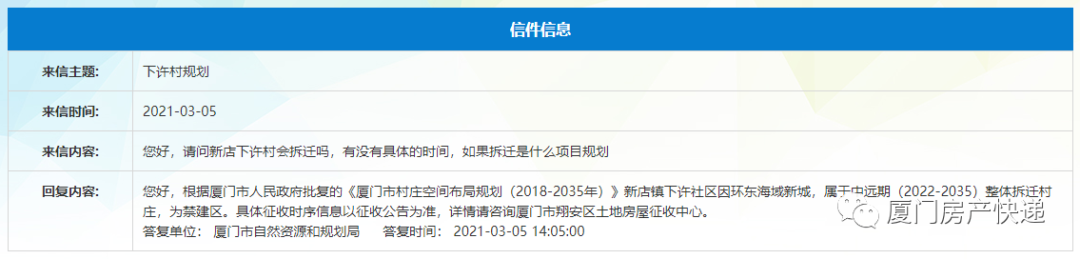 根据厦门市人民政府批复的《厦门市村庄空间布局规划(2018-2035年)》新店镇下许社区因环东海域新城,属于中远期(2022-2035)整体拆迁村庄,为禁建区。