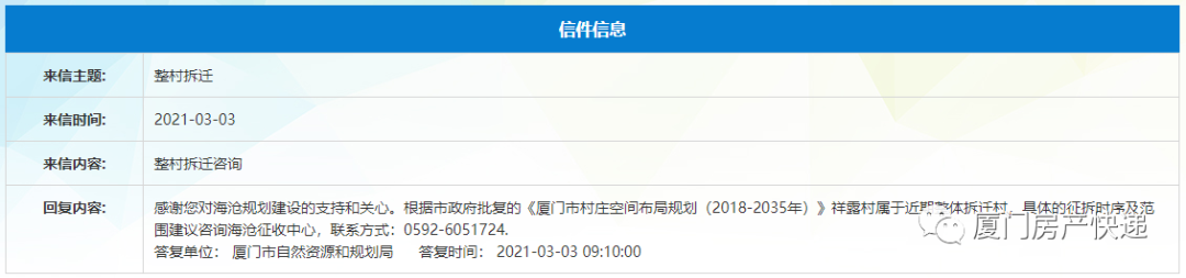 根据市政府批复的《厦门市村庄空间布局规划(2018-2035年)》祥露村属于近期整体拆迁村。