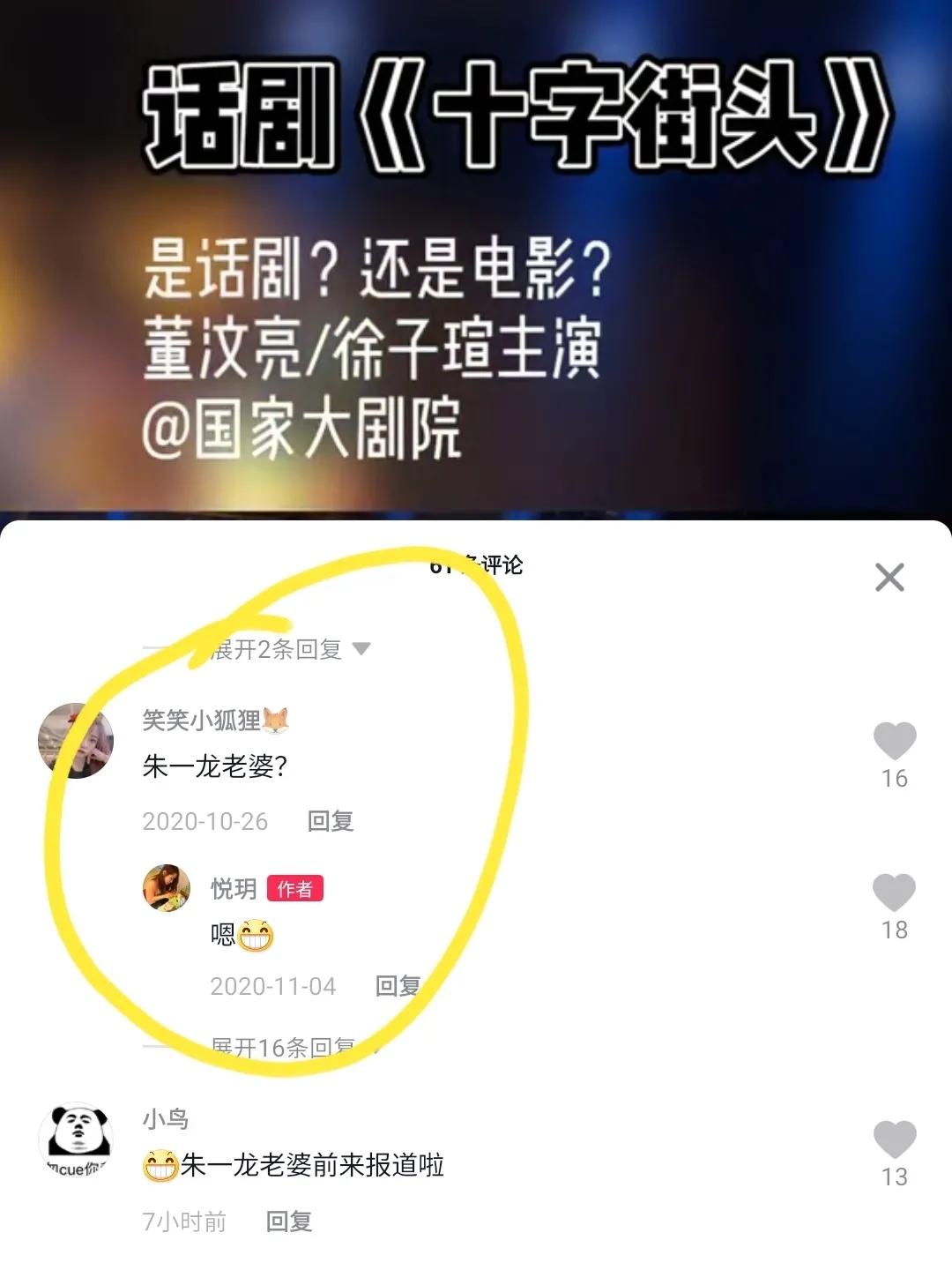 粉丝们跑过去问该短视频账号博主,这个话剧《十字街头》的女主角徐子瑄,是不是就是朱一龙的老婆。没想到,该博主回复粉丝的话居然是默认,“嗯”!