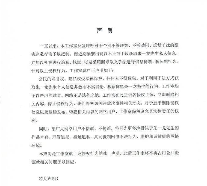 对于以上种种传闻,朱一龙本人从来没有公开回应过,反而是他的经纪公司,代表他出来警告那些侵犯他隐私的私生饭和媒体们。