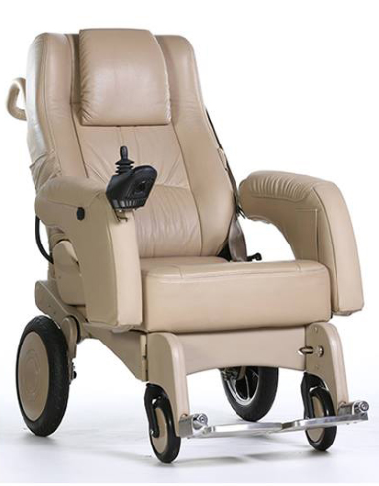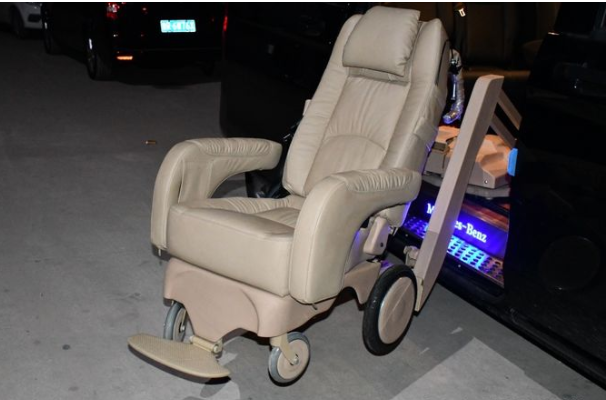 轮椅为真皮包覆、操纵杆方向控制、5档变速 6公里/小时、电池可以连续使用2-3小时、电池充电饱和时间为4小时。