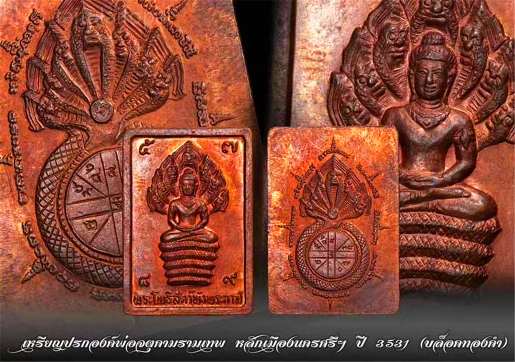 同期一起制作加持的还有一批七龙泽镀金立尊法相,材质和加持阵容还是很强大的,阿赞坤潘带领和2530年同批加持团队,由阿赞kopong,阿赞初,龙耐等等合力加持。当时总共举行了几次大法会加持这批泽镀金,包括在Wat Mahathat和Lak Muang。这期2532年天神七龙泽度金口碑很好,泰国的很多佛牌书刊皆有记载。taifulaifopai