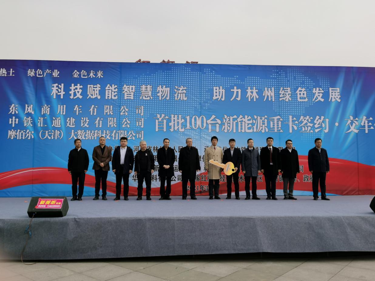 3月16日,东风商用车有限公司、中铁汇通建设有限公司、摩佰尔(天津)大数据科技有限公司,在河南林州举行首批100辆新能源重卡东风天龙KL电动牵引车签约及交车仪式。