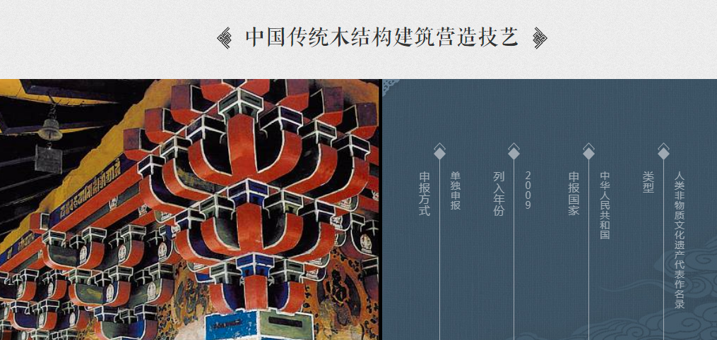 2009年,我国以《中国传统木结构建筑营造技艺》为题,以单独申报的方式,申请“人类非物质文化遗产代表作名录”。说明文字大概内容为: “以木材为主要建筑材料,以榫卯为木构件的主要结合方法,以模数制为尺度设计和加工生产手段的建筑营造技术体系。”