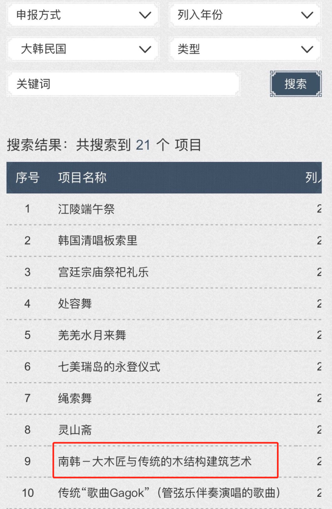 2010年,韩国以《南韩-大木匠与传统的木结构建筑艺术》为题,以单独申报的方式,申请“人类非物质文化遗产代表作名录”。说明文字大概是:“在不用一钉一卯的情况下把分开的木件联锁在一起,从而创造所谓的‘千年不倒的连接’。”