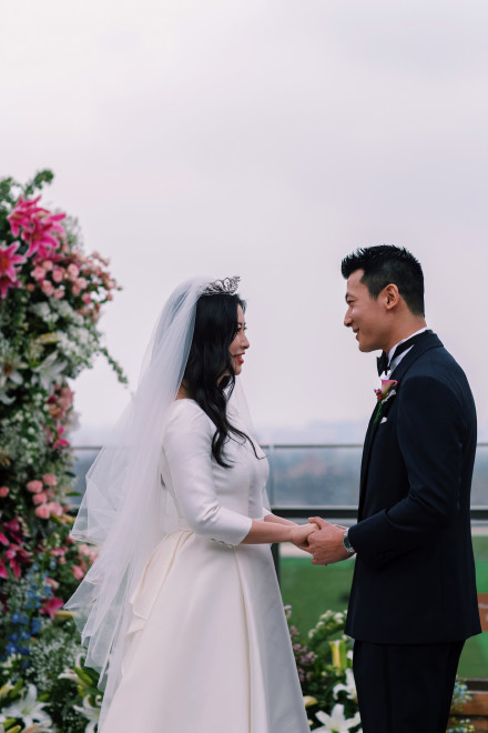 婚礼现场布置比较简约,不过朱珠和新郎脸上的笑容却很幸福。
