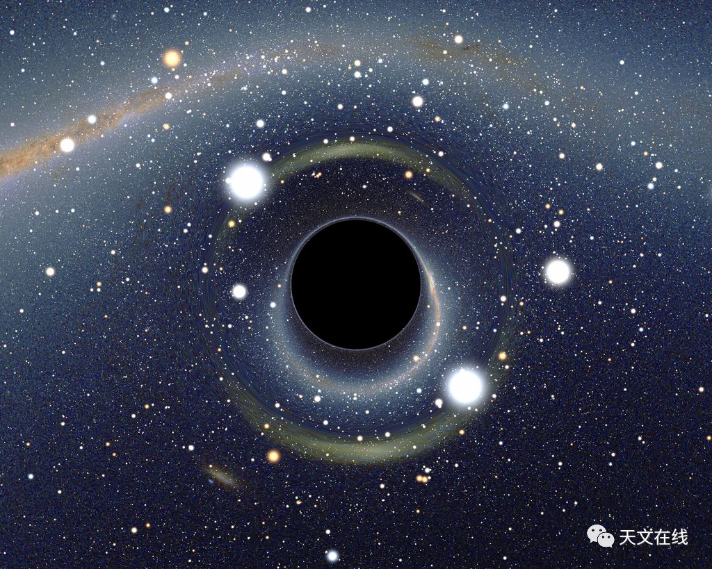 图解:大麦哲伦云面前的黑洞(中心)的模拟视图。请注意引力透镜效应,从而产生两个放大,以星云最高处扭曲的视野。银河系星盘出现在顶部,扭曲成一个弧形。