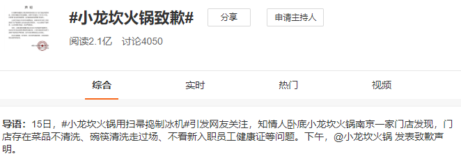 其实还能再加一个晚会前上热搜的小龙坎,经过后厨乱象问题、地沟油事件后,这次小龙坎又在食品安全上踩雷,即使品牌迅速道歉,网友也不怎么买账。