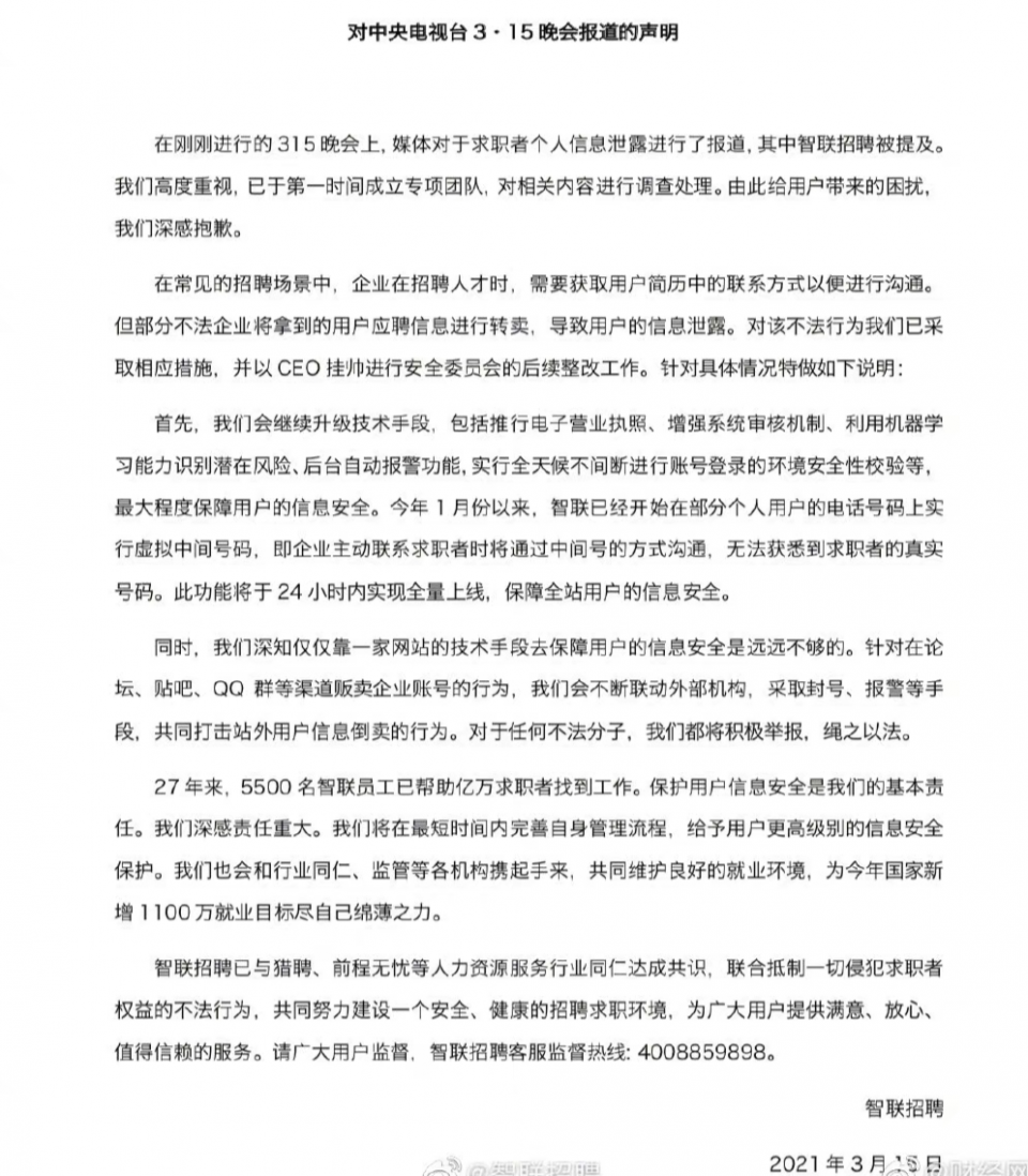 比如智联招聘,虽然后期的改进措施比较完善,但没有提到自己平台售卖简历,反而一个锅甩给了部分不法企业,试图转嫁责任,你是把错摘清楚了,挨打不立正,消费者的品牌好感度肯定大打折扣。