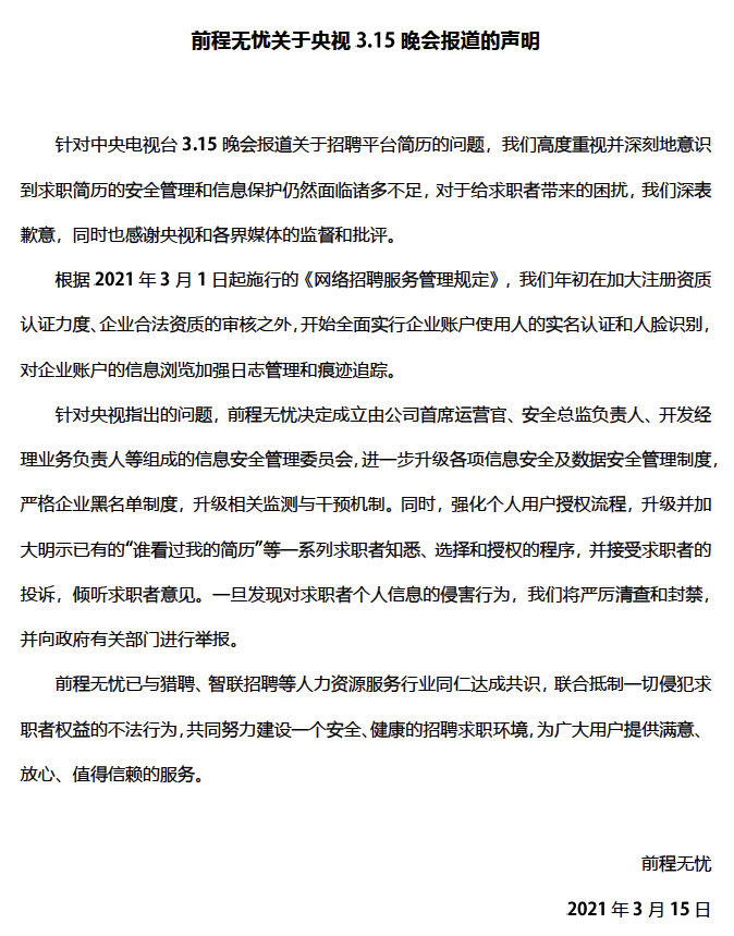 前程无忧:成立安全管理委员会