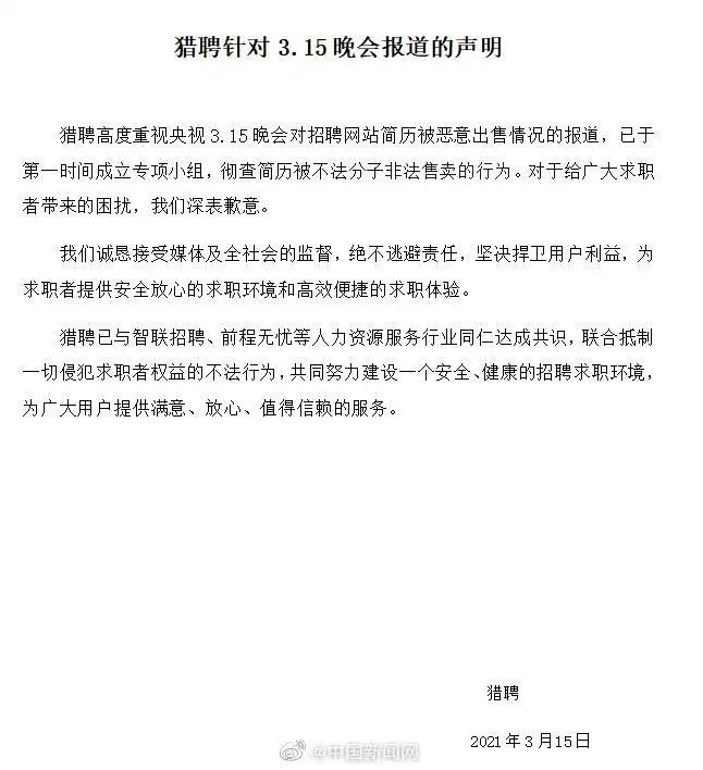 猎聘:彻查售卖行为