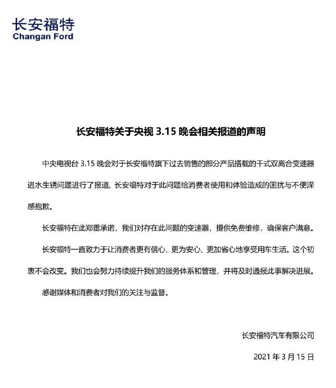 长安福特:免费提供维修,持续提升服务体系和管理