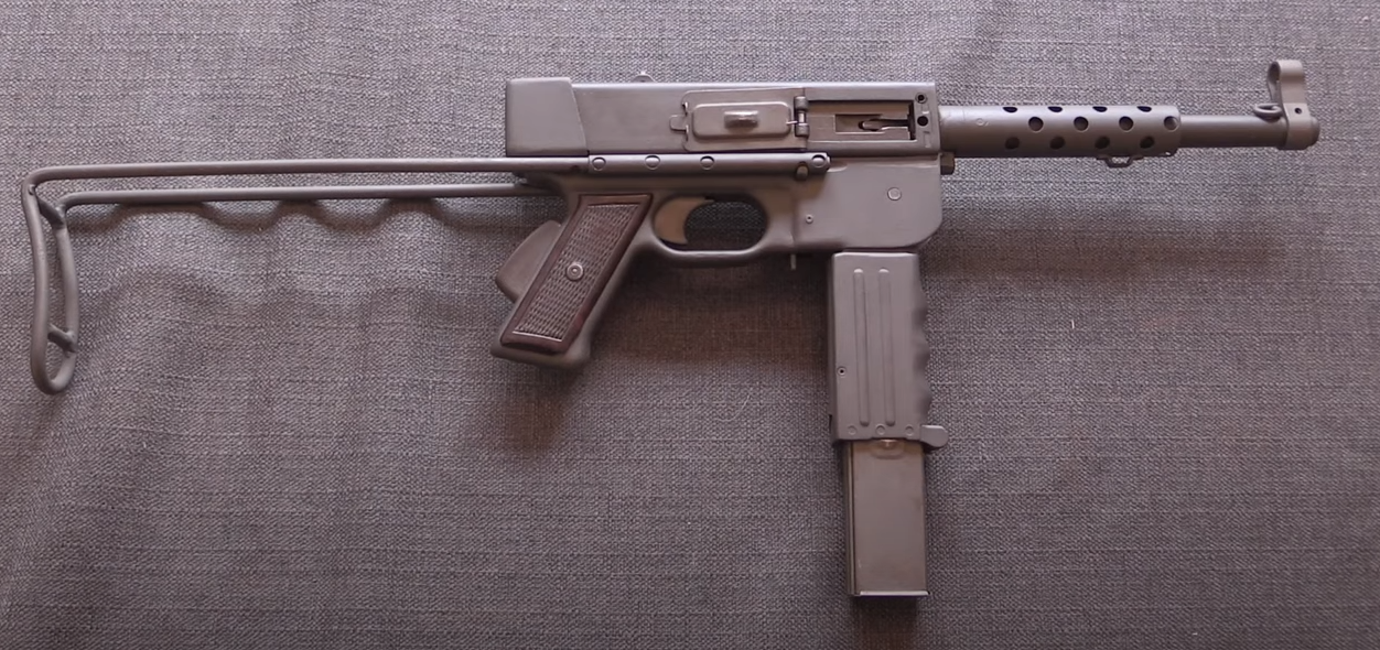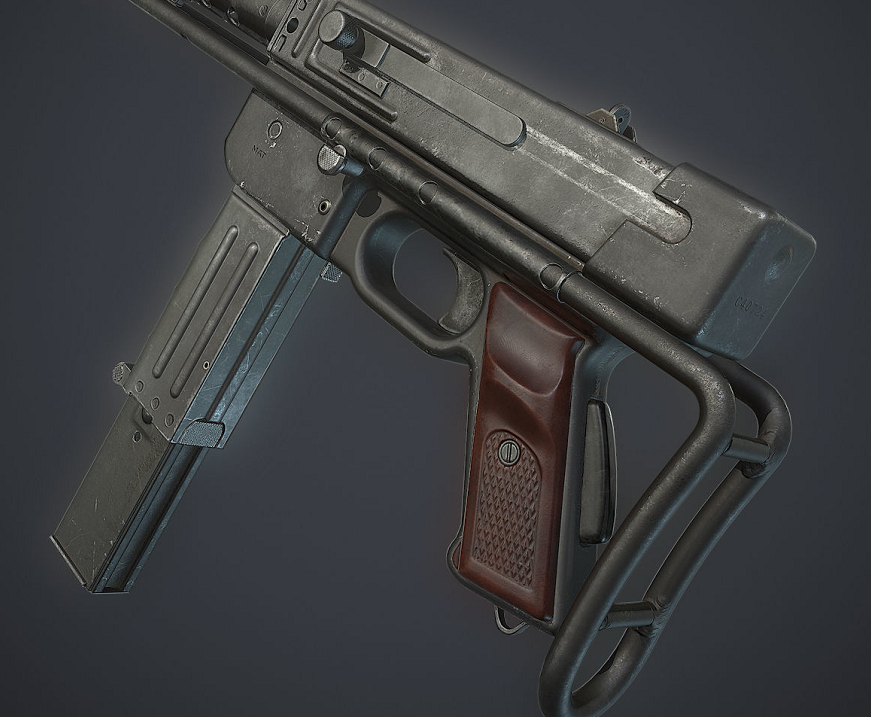 这把MAT49非常简单,用的是自由枪机、开膛待击,方形的大铁块枪机。机匣等用的是冲压钢板,枪管上带着一小节散热罩。其枪机比较重,复进簧强度也比较高,射速上,这把枪是每分钟600发,这是当时很多冲锋枪非常常见的射速。当年波波沙、汤姆逊都因为高射速被诟病,都想办法降低射速,毕竟射速太高,可操控性就降低了。