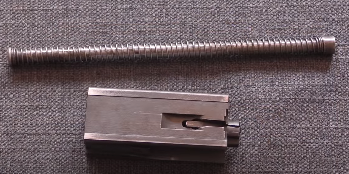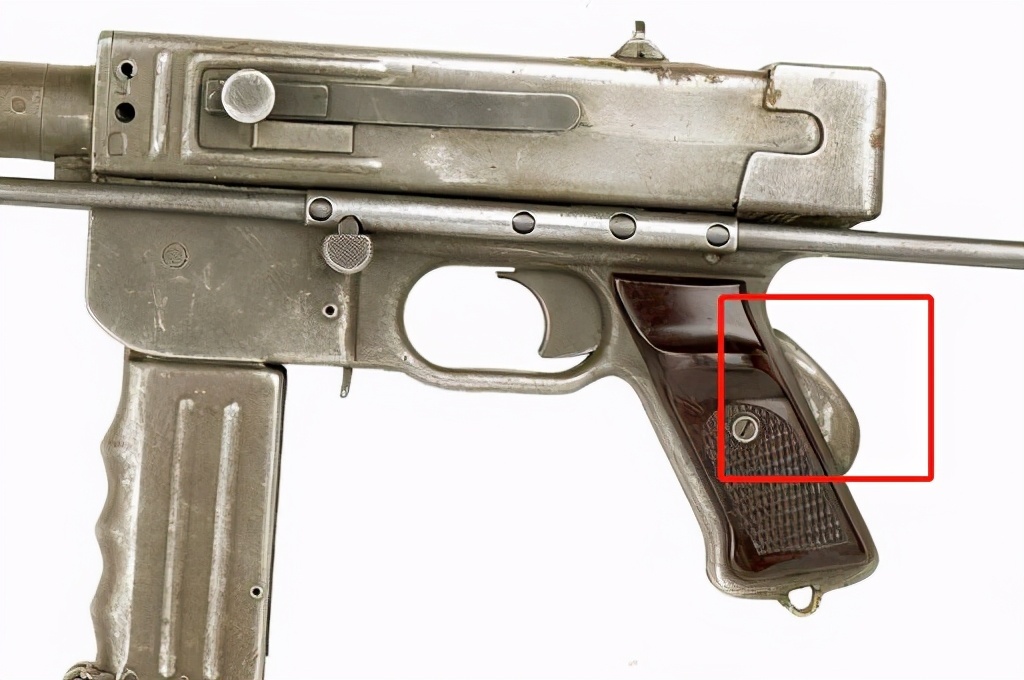 而这种自由枪机+开膛待击的冲锋枪,安全性是有一定的问题的,有一定的走火风险。MAT49为了安全,设计了两道保险,一道位于拉机柄,通过拉机柄可以锁住枪机,另一个保险位于握把后端,握把后端有一块按钮,握住握把和按钮的时候,扳机才可以扣动,才能够完成击发,而且只有握住握把上的按钮,才能拉动拉机柄带动枪机。