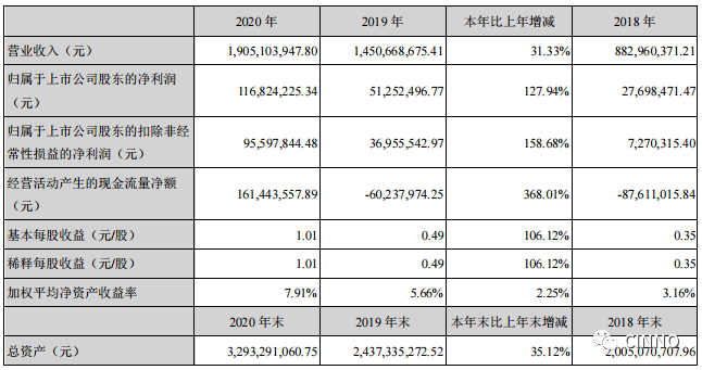 3月17日晚间,三利谱(002876.SZ)发布2020年年度报告,该公司年内营业收入为19.05亿元,同比增长31.33%。归属于上市公司股东的净利润为1.17亿元,同比增长127.94%。归属于上市公司股东的扣除非经常性损益的净利润为9559.78万元,同比增长158.68%。基本每股收益为1.01元。