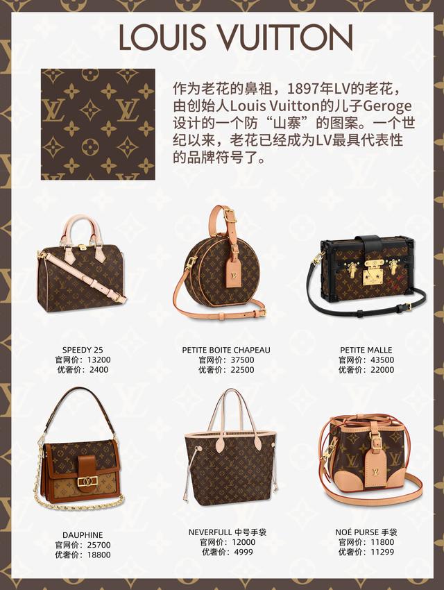 作为老花的鼻祖,1897年LV的老花,由创始人Louis Vuitton的儿子Geroge设计的一个防“山寨”的图案。一个世纪以来,老花已经成为LV最具代表性的品牌符号了。