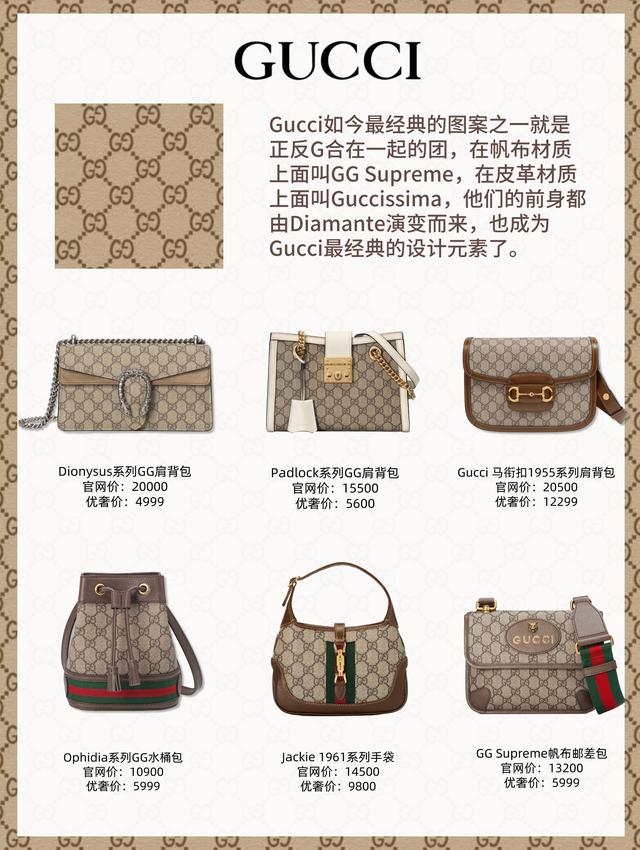 Gucci如今最经典的图案之一就是正反G合在一起的团,在帆布材质上面叫GG Supreme,在皮革材质上面叫Guccissima,他们的前身都由Diamante演变而来,也成为Gucci最经典的设计元素了。