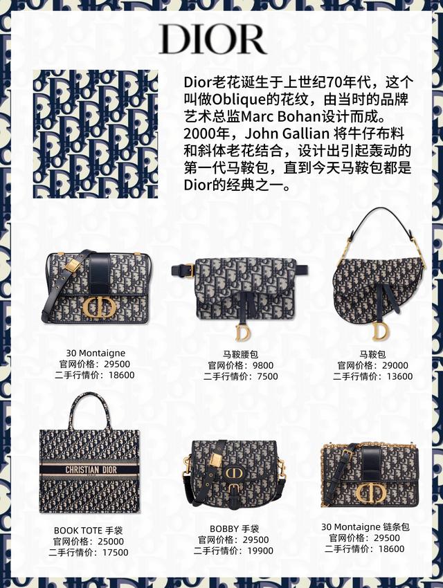 Dior老花诞生于上世纪70年代,这个叫做Oblique的花纹,由当时的品牌艺术总监Marc Bohan设计而成。2000年,John Gallian 将牛仔布料和斜体老花结合,设计出引起轰动的第一代马鞍包,直到今天马鞍包都是Dior的经典之一。