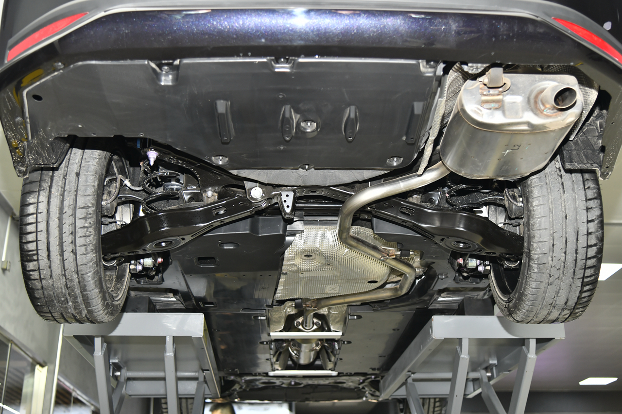实拍车型的底盘采用了前麦弗逊+后多连杆式悬架结构,整体布局非常规整,不仅铺设了大面积的隔热瓦,在尾部还带有扰流扩散器,细节方面值得肯定。因为目前还不能试驾,所以这套底盘的驾驶质感如何还暂无定论,我只能自行脑补亚洲狮的各种动态表现。
