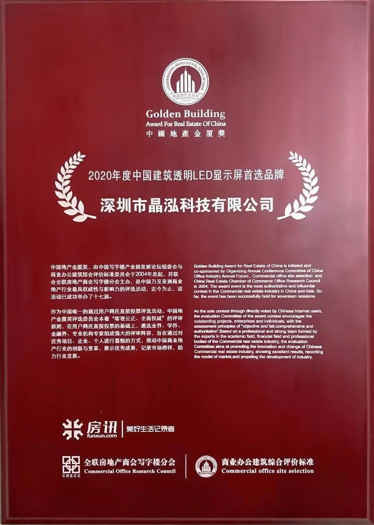同期举办的2020年第十七届中国地产金厦奖颁奖典礼盛大举行。深圳市晶泓科技有限公司载誉而归,荣获“中国地产金厦奖——2020年度中国建筑透明LED显示屏首选品牌”,可谓实至名归。
