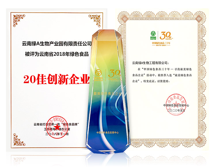 2018年,绿A就已经获评为云南省绿色食品牌-“20佳创新企业”,2020年绿A又重磅拿下中国农业部“最美绿色食品企业”称号。溯及更早,绿A早在2000年就通过绿色食品认证,之后连续6届获批至今。其实,从绿A的品牌名就不难看出,绿色一直是绿A的底色。