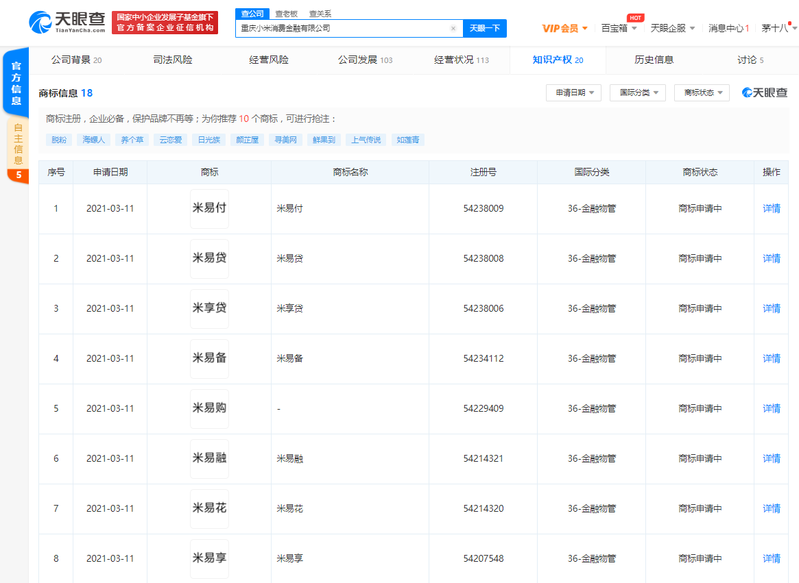 【环球网综合报道】天眼查App显示,近日,重庆小米消费金融有限公司申请注册“米易付”“米易贷”“米易融”“米易花”等多个商标,国际分类为金融物管,商标状态均为“商标申请中”。