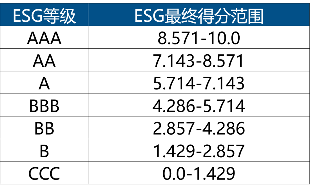 公司行业调整后的得分(Final Industry Adjusted Score)按照分值区间最终对应于最佳(AAA)和最差(CCC)之间的七个序列。