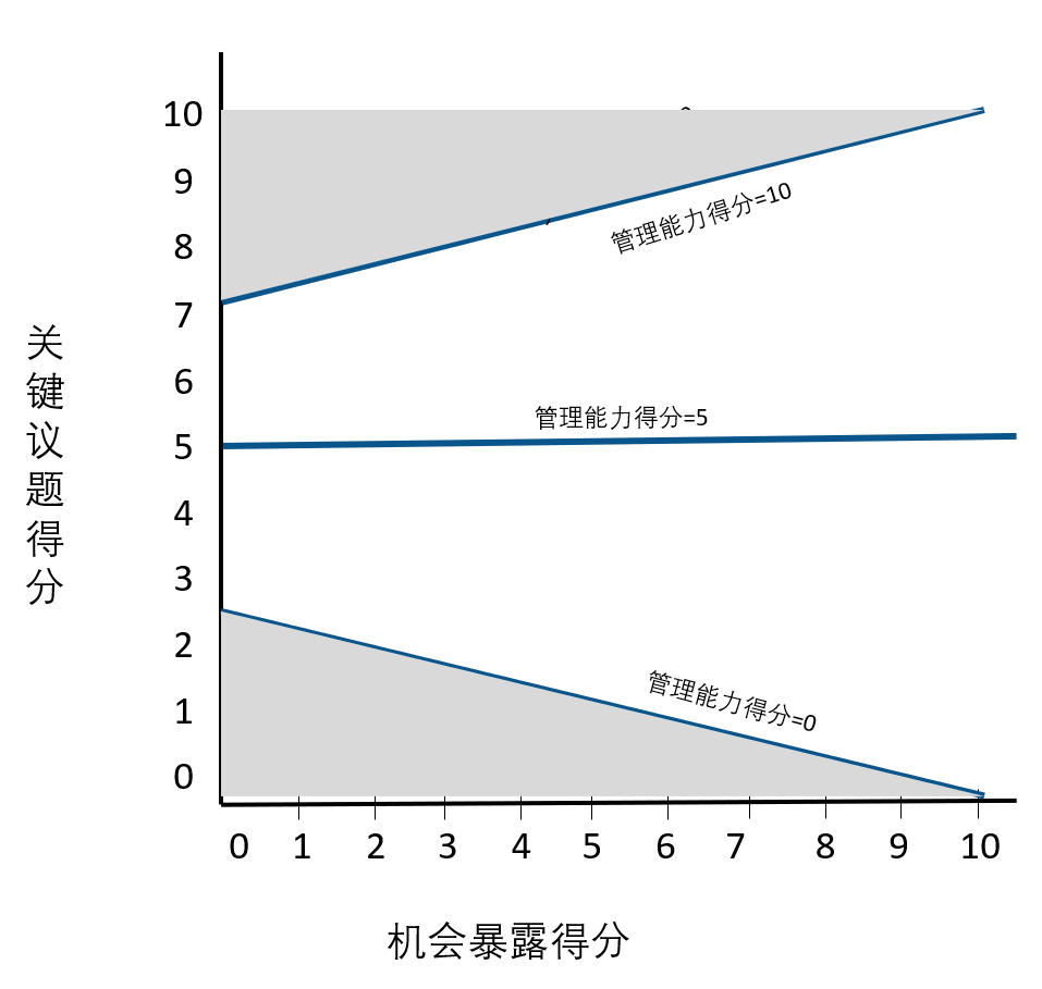 当公司面临相同程度的机遇时,具备卓越管理能力的公司将指向更高的机会项得分,采用一般管理能力的公司指向一般的机会项得分,而采取较差管理能力的公司将导致公司较低的机会项得分。机会项的评价也同样采用0-10 分的打分方法。