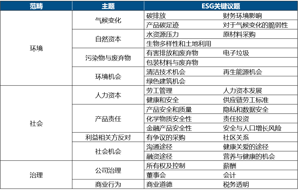 全球可持续发展的现状与趋势(例如气候变化,资源稀缺,人口结构变化)以及公司运营的性质构成了环境、社会和公司治理方面的风险与机遇。MSCI通过定量模型确定了每个行业的重大风险和机遇,并构建了一套指标框架。