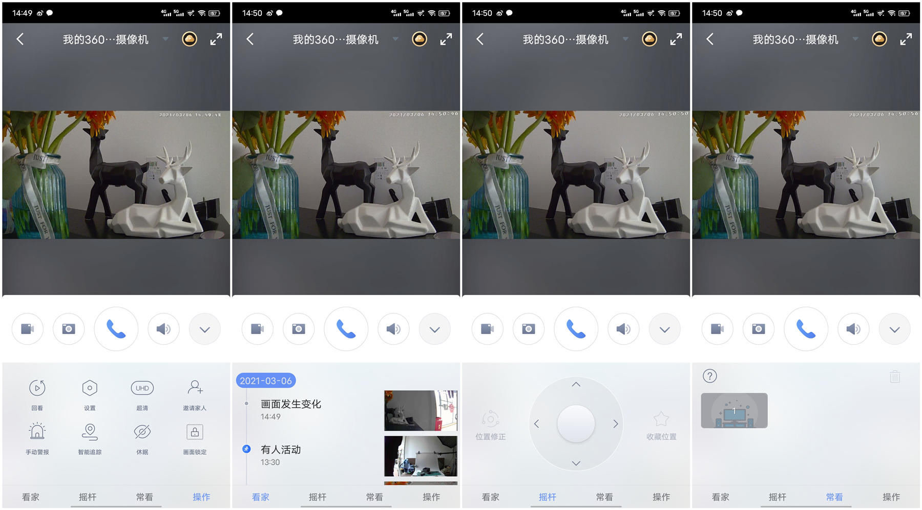 绑定相机后就可以在手机端对设备进行操作了,非常熟悉的界面,在这上面可以实现拍照,录像,“打电话”(手机与摄像头之间进行语音通话),静音等操作。在下面菜单里面可以支持视频回看,摄像头和角度调整,摄像机智能追踪等等操作。