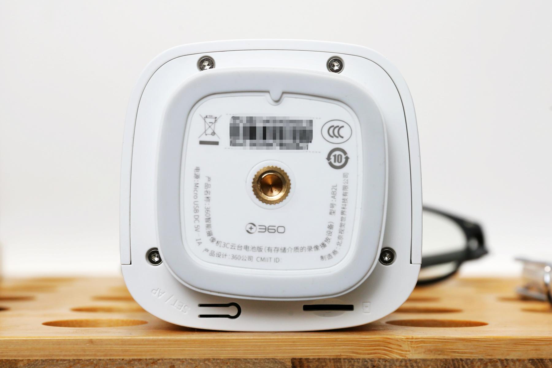 摄像机的底部,有一个复位按钮,TF卡槽,以及可以水平旋转的底座,底座周边有一圈硅胶垫,让机身站立更稳,中间是一个标准四分之一螺纹孔,支持主流支架的安装。